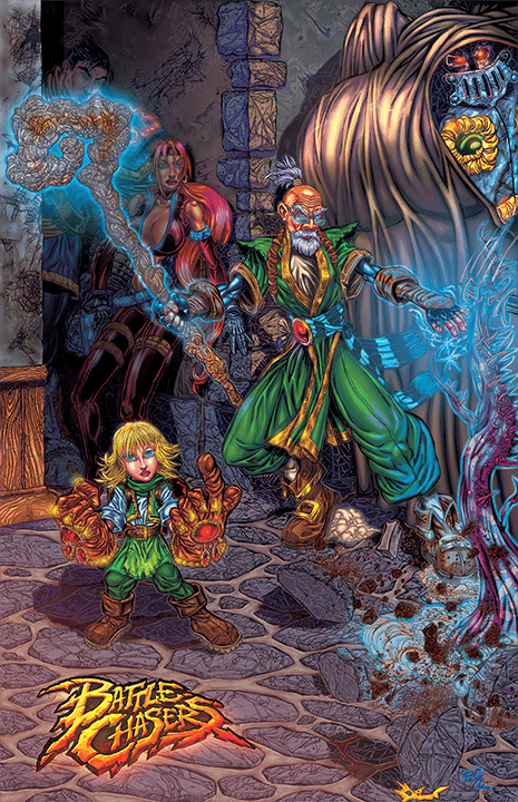 This 11"x17" Battlechaser's art print is printed on a holographic shard paper that gives it a really cool look. This illustration depicts Joe MADureira's characters from his awesome comic Battlechaser's in an exciting action scene. Knolan and the rest of the crew step out of a city alley only to be spotted by the city's guard as they are wanted fugitives!